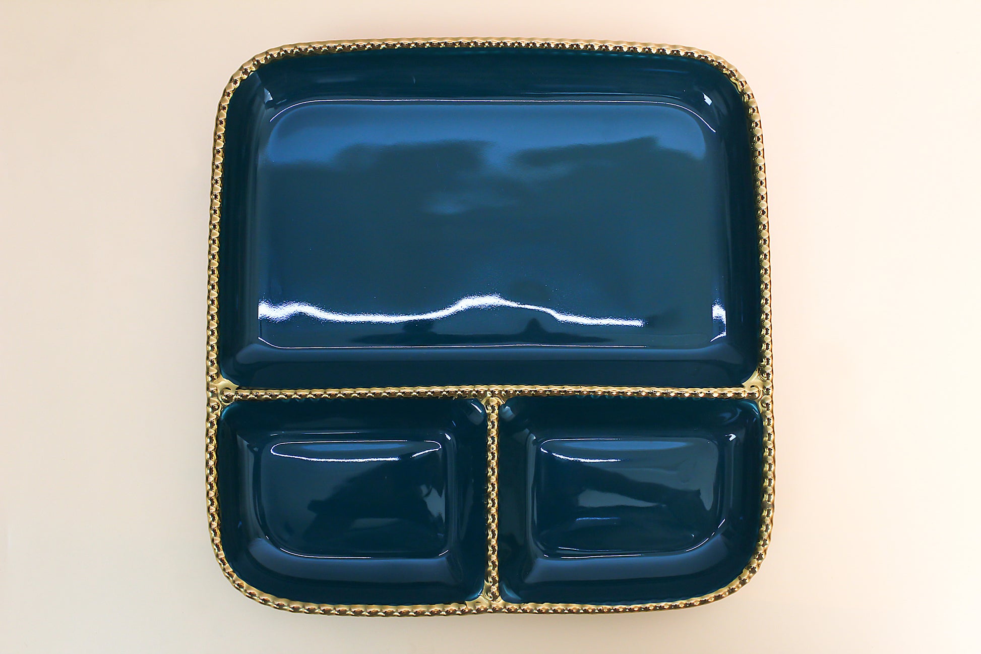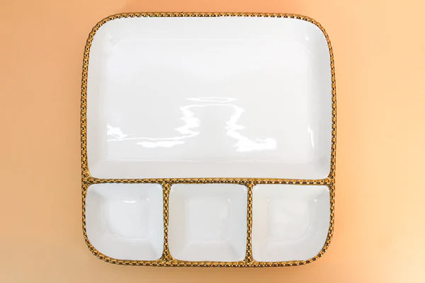 ceramic plate with a divided design, featuring two smaller compartments on one side and a larger open section on the other side